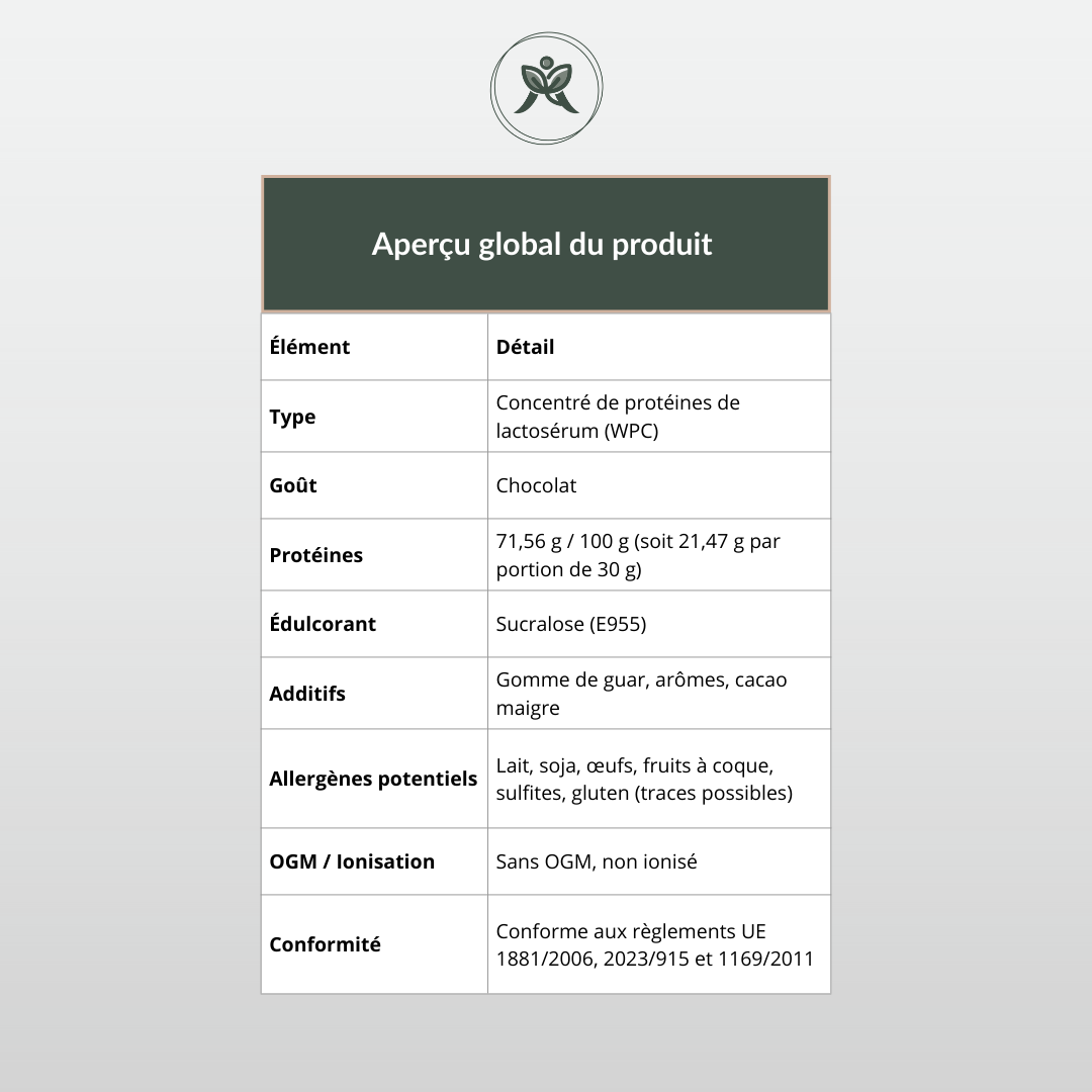 Contrairement à certaines formules ultra-transformées, cette whey chocolat se distingue par sa composition simple et efficace :